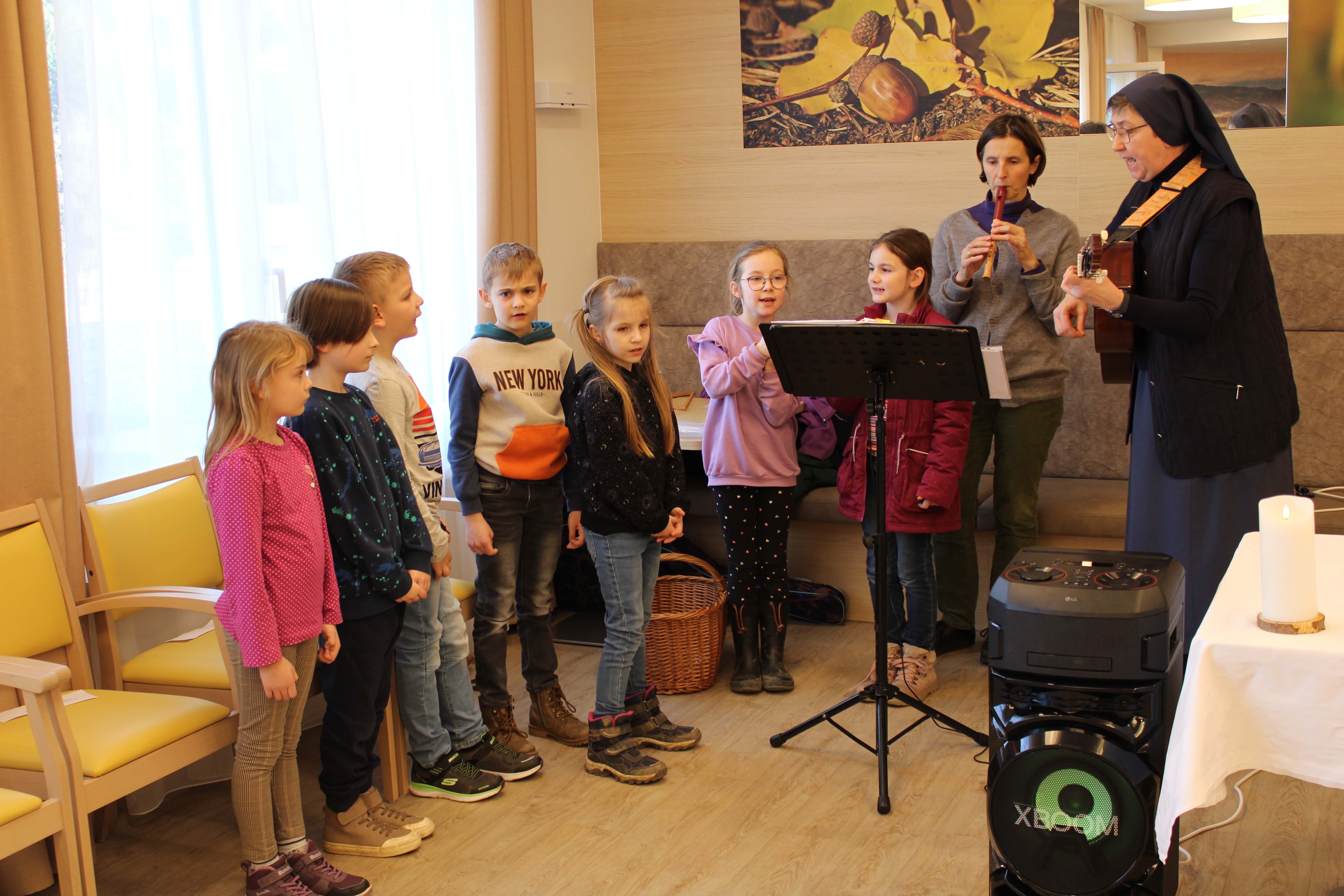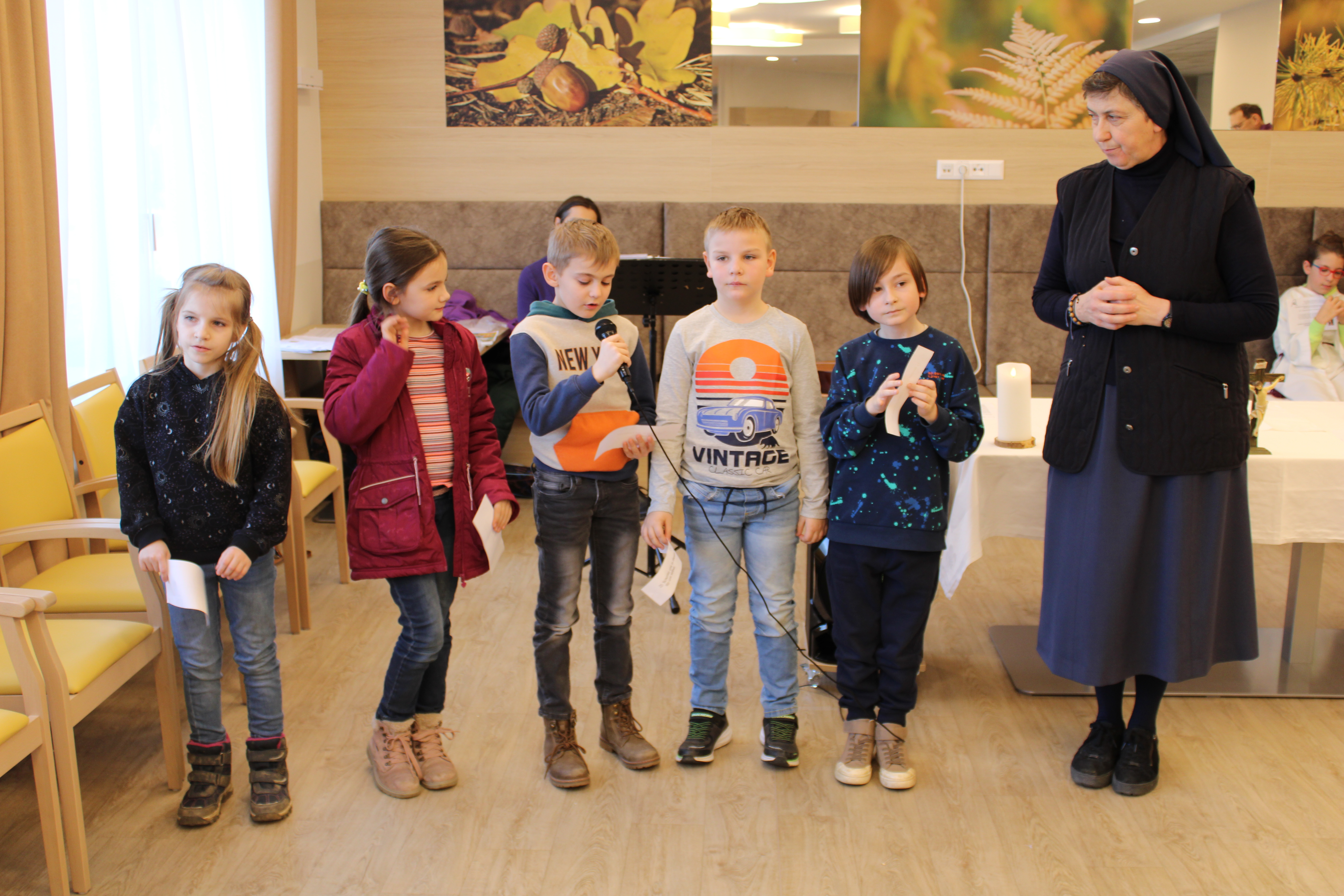 Im SeneCura Pflegezentrum Dobl fand kürzlich die monatliche Heilige Messe direkt im Haus statt. Diesen Monat wurde die Zeremonie jedoch von sieben fröhlichen Erstkommunikationskindern und der Schwester Maria mitgestaltet. Die Seniorinnen und Senioren freuten sich sehr über die kleinen Gäste und der Raum füllte sich mit großer Freude und einer Atmosphäre der Zusammengehörigkeit. Nach dem bewegenden Gottesdienst wurden die Kinder sowie die Bewohner:innen zu köstlichen Muffins und erfrischenden Säften eingeladen. Diese Messe war ein Moment der Gemeinschaft und erfüllte die Herzen der Seniorinnen und Senioren sehr.