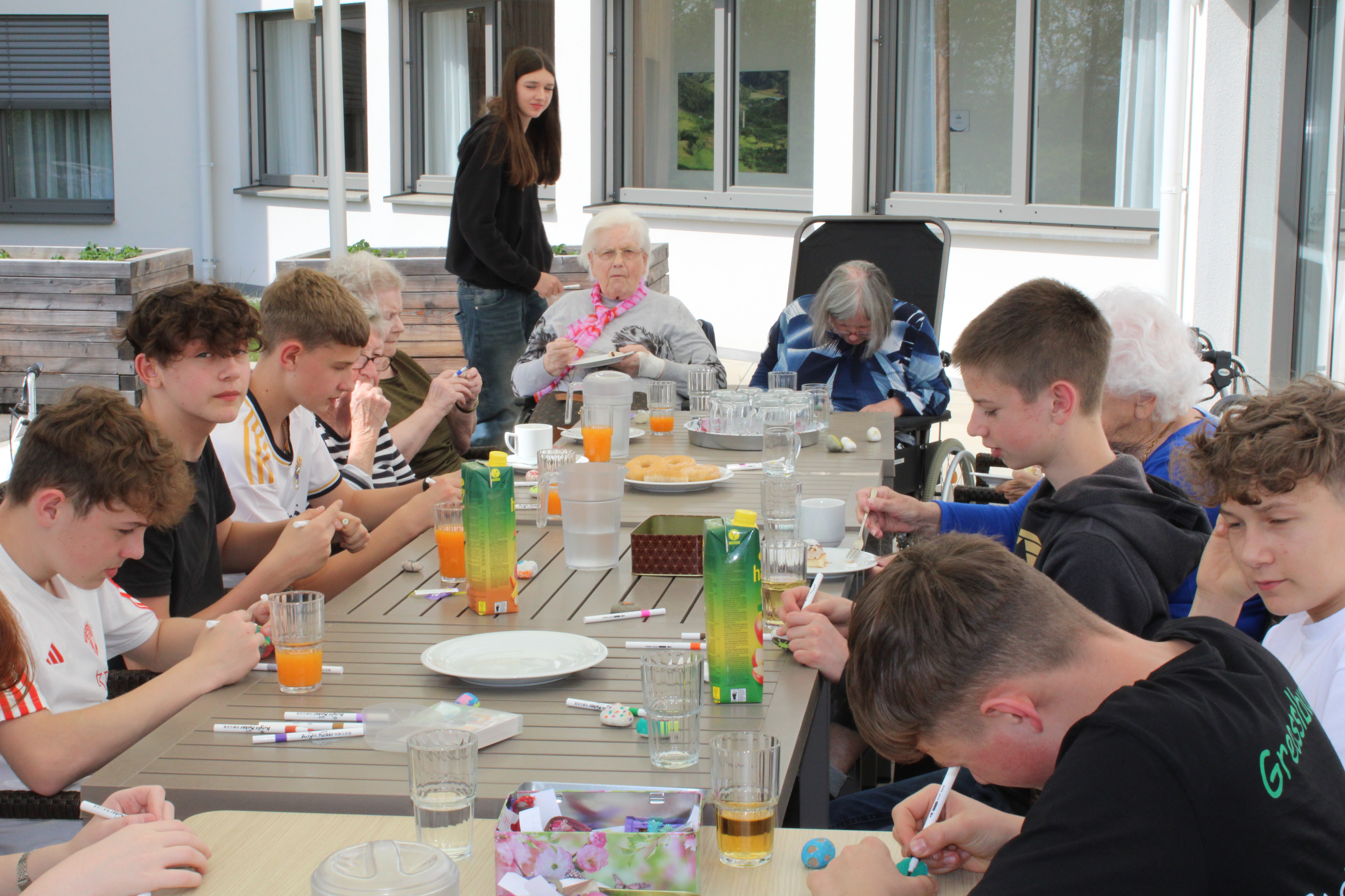 Letztens erhielten die Bewohner:innen des SeneCura Pflegezentrums Dobl Besuch einer örtlichen Firmgruppe. Begleitet von Renate Köberl nahmen sich acht Jugendliche die Zeit, bei herrlichem Wetter im Garten gemeinsam mit den Bewohner:innen kunterbunte Steine zu bemalen. In bester Gesellschaft wurde ein Stein nach dem anderen individuell und in liebevoller Handarbeit bemalt. Zur Stärkung standen leckere Donuts, verschiedene Säfte und Kaffee zur Verfügung. Die kreative Aktivität sorgte für einen schönen Nachmittag, viel Gelächter und lustige Erzählungen.