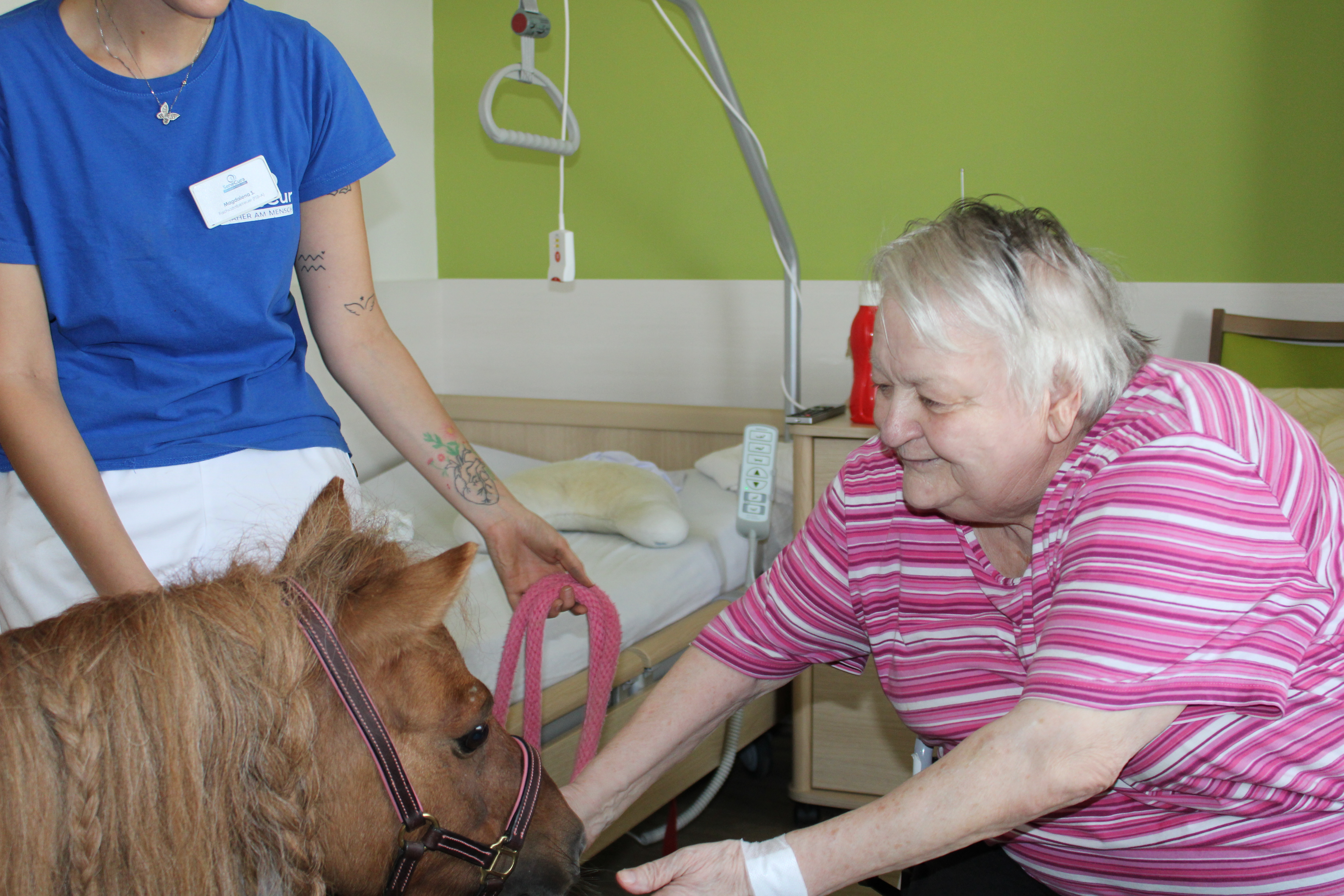 Unlängst besuchte DSBA Magdalena Sperl die Bewohner:innen des SeneCura Pflegezentrums Dobl mit ihrem Pony „Maxi“. Die Bewohner:innen waren begeistert von dem außergewöhnlichen Gast, der auch den Seniorinnen und Senioren auf dem Zimmer mit seiner liebevollen Art eine Freude bereitete. Mit Apfelspalten konnten die Bewohner:innen das Pony füttern und über Streicheleinheiten freute sich der Vierbeiner selbstverständlich auch sehr. Als das kleine Pony gestärkt war, begeisterte es alle Anwesenden mit faszinierenden Kunststücken. Auf den nächsten Besuch von Maxi freuen sich die Bewohner:innen bereits sehr.